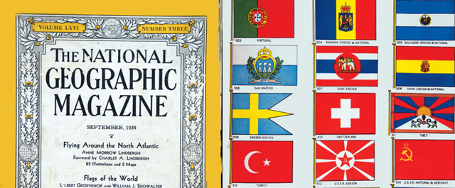 The 1934 edition of the National Geographic Magazine publishes 'Flags of the World' showing 77 independent countries including the Tibetan National Flag. It is assumed that The National Geographic Society obtained the Tibetan Flag from Tsarong Dasang Dadul, the Commander-in-Chief of the Tibetan Army and a member of the Geographic Society. Page number 383 of The National Geographic 1934 edition presents Tibet's National flag along with 77 flags of independent countries with a truthful description: "Tibet: With its towering mountain of snow, before which stand two lions fighting for a flaming gem, the flag of Tibet is one of the most distinctive of the East." //