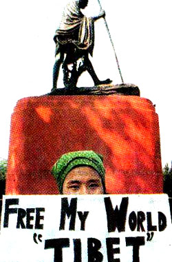 They gathered in front of Mahatma Gandhi's statue for a 12-hour hunger-strike today, on the occasion of the 44th Tibetan National Uprising Day. They seemed a bit confused as rickety state buses passed by belching out smoke.